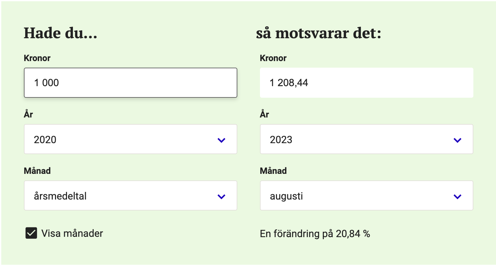 Här kan ni se hur inflationen påverkat penningvärdet. Knappa in timarvode, lön eller kapital från t ex 2020 och se vad ni borde ha idag. OBS! Varning för att ni kan få en deppig fredag.