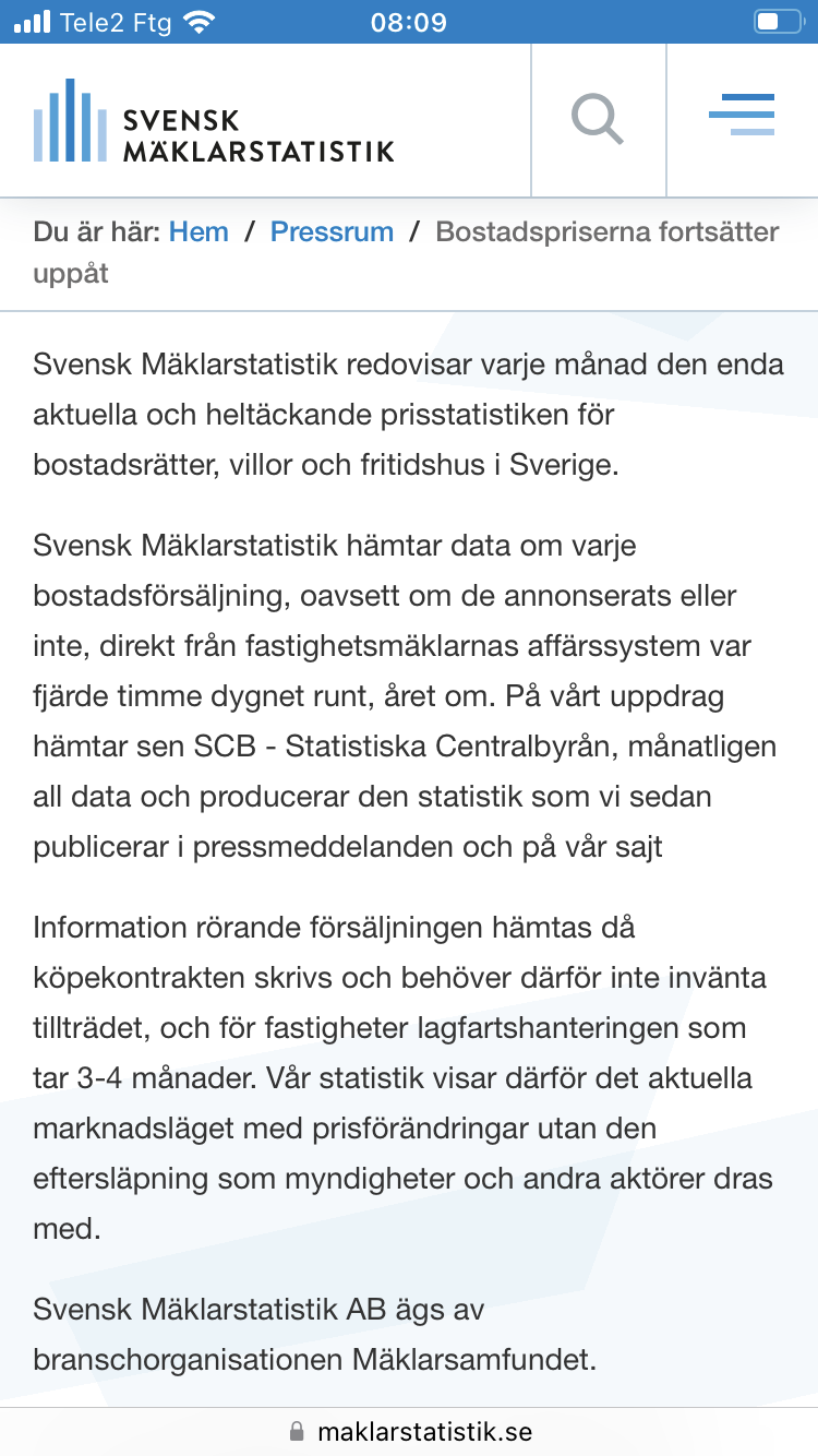 Jag tror att svensk mäklarstatistik ger en mer rättvisande bild över marknadsläget. Dom släppte relativt nyligen en rapport som pekar på att bostadspriserna fortsätter uppåt