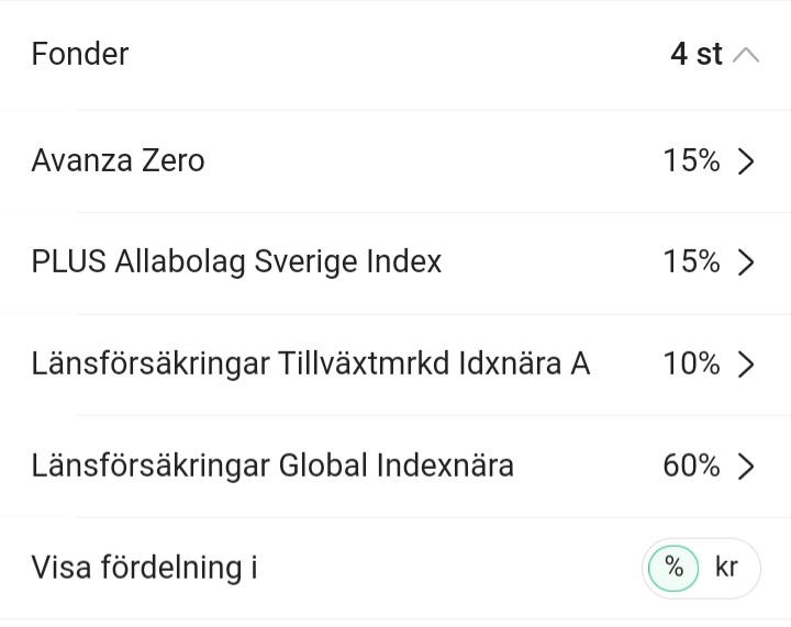 Hallådär och ursäkta min grundliga kunskap inom detta ämne. Jag är 24 år så har en del år kvar till pension men vill börja så smått. Vill ha ett simpelt sparande som täcker det som bör täckas liksom för att va ett bra o tryggt sparande, inget för svårt och klyddigt. Självklart vill jag ha avkastning men ser hellre simpelt och någorlunda tillväxt än att jag måste läsa på massor och ha koll på saker jag inte förstår. Nedan kan ni se mina val :slight_smile: