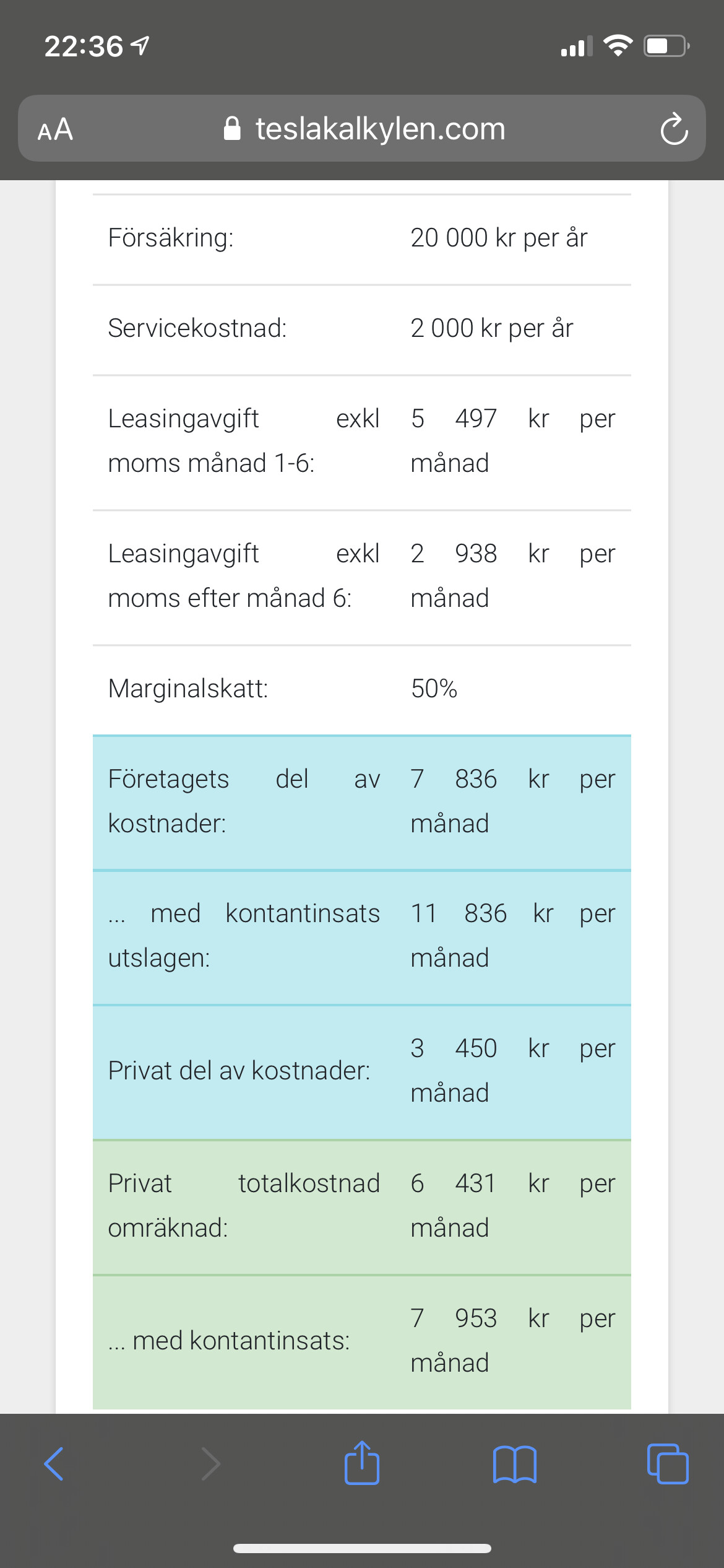 Jag förstår inte hur det kan vara mer fördelaktigt att privatleasa. Vi kommer företagsleasa (egenföretagare) model Y och jag jämförde våran kalkyl på teslakalkylen med din och den är ganska lika förutom försäkring (Stockholm). ”Privat totalkostnad omräknad” för oss blir 6431, privat med kontantinsats 7953. Jag är såklart intresserad av att göra bästa dealen. Jag förstår inte, vad är det jag missar?