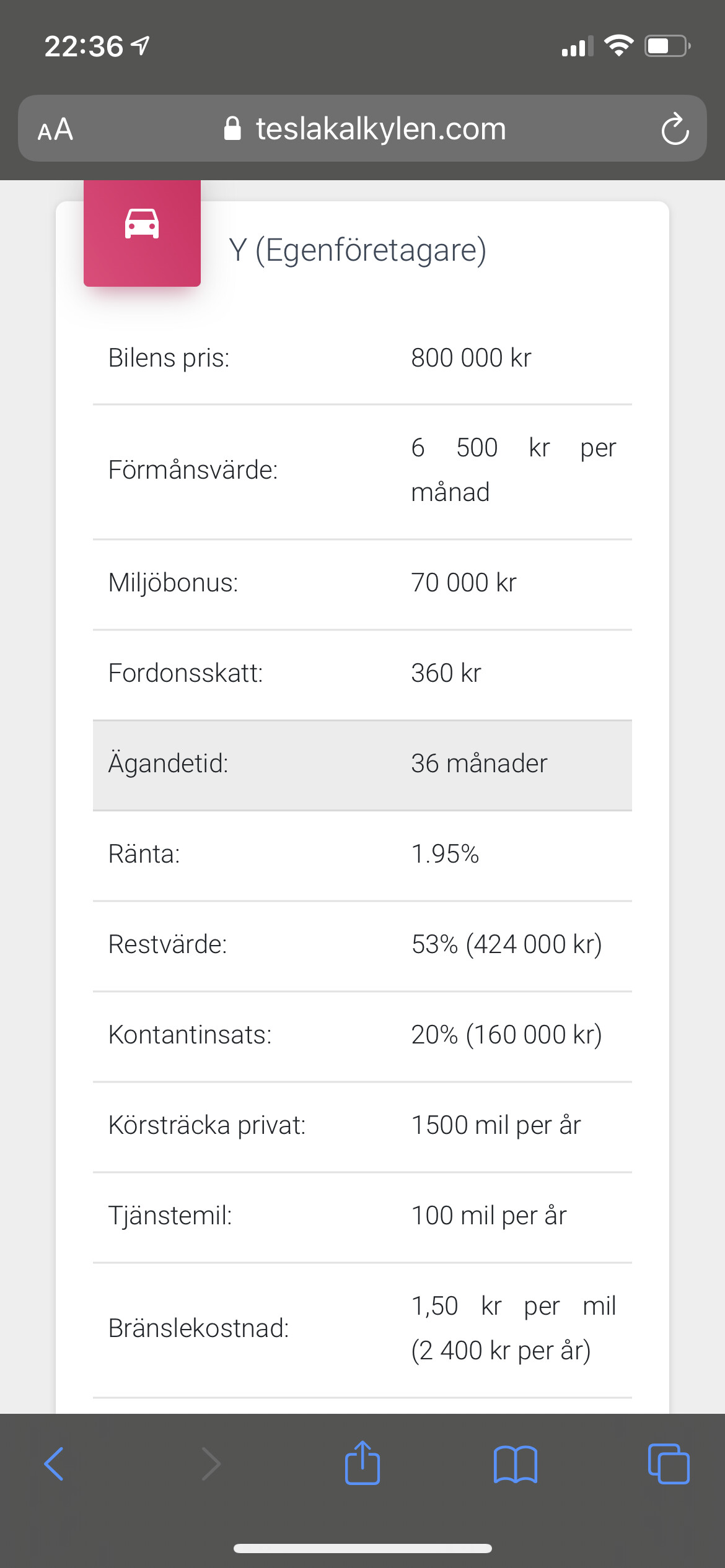 Så nej, jag hade inte leasat en Tesla privat. På företaget är det en annan sak, men som privatperson så gör du en bättre affär genom att köpa den.