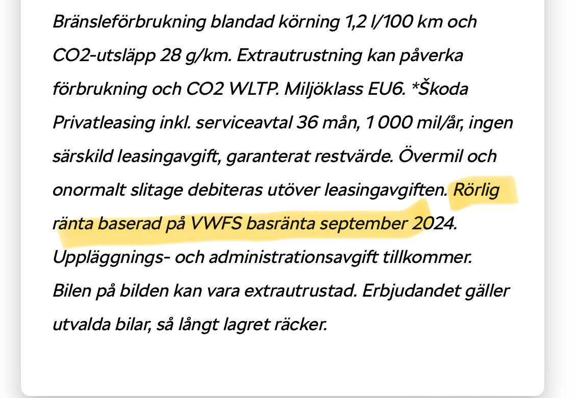 För mig som har avtal med VWFS och en månadskostnad på ca 5500 kr innebär en säkning av VWs basränta på 1.0 procent ungefär -400 kr i månaden.