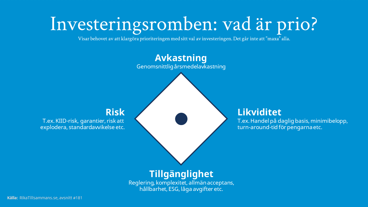 I avsnitt “Del 2 om investeringsbedrägerier” pratar jag om konceptet Investeringsromben. Det var en grej som slog mig när vi spelade in avsnittet i veckan och jag tror att vi gemensamt kan göra den bättre och göra den till ett verktyg för att snabbt analysera en investering från flera olika håll. Eller så här, det vore coolt om vi kunde (eller så hade jag bara otur när jag tänkte).