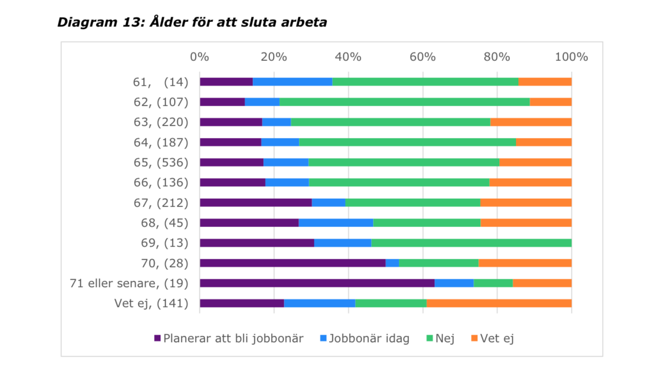 Det framstår som hyfsat tydligt att de 40% som svarat såhär, inte förstår att de kommer måsta jobba fulltid (= inte kunna ta ut delvis pension alls så tidigt som de föreställer sig). Och då kommer det inte bli så mycket “jobbonär” av det till syvende och sist.