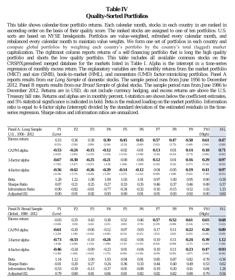"We test the pricing of quality over a long sample of U.S. stocks from 1956 to 2012