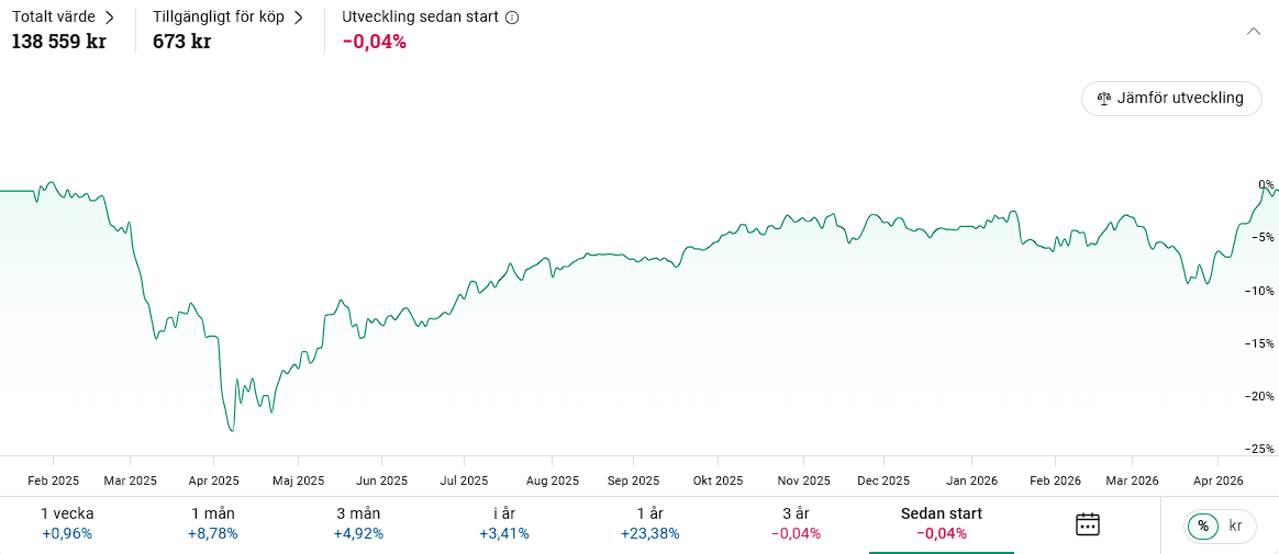 Tänker att du prickade in fel tider under året. Hade du gått in med pengarna April 2025 så hade du varit +23% istället. Hade du haft pengarna på lysa så hade den grafen sett liknande ut, förutsatt att du var 100% aktier där.