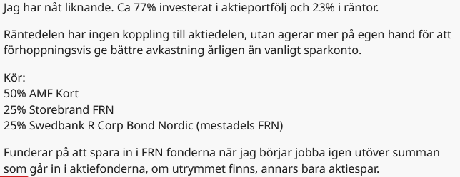 Det är väl så att jag känner mig inte lika riskbenägen som @Guldfeber men vill ta lite mer risk än @MattiasA90