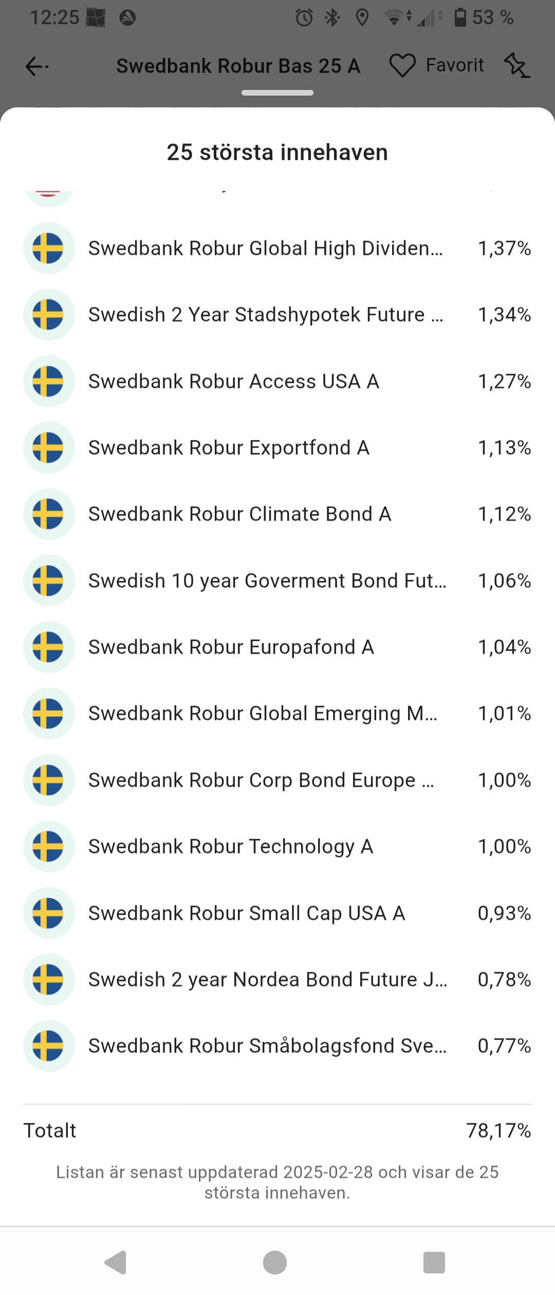Jag är ny på forumet men har sparat länge och följt forumet med stort intresse. Ni får ursäkta om detta kanske postas på fel ställe. Nu till min fråga. Jag har en mamma, 75+, som bland annat sparar över en miljon i en Swedbank fond, Robur Bas 25. Verkar investera 75% i räntor och 25% i aktier. Utvecklingen har minst sagt varit blygsam med +1,56% på ett år (enligt Avanza) och med en avgift på 0,96%. Morsans bankman verkar tycka detta är en bra fond för henne och morsan tycker detta också. Är det något jag missar här? Min tanke är att 75% räntor lika väl kan placeras på ett obundet/bundet räntekonto på en nischbank och 25% i en indexfond. Vad tycker ni?