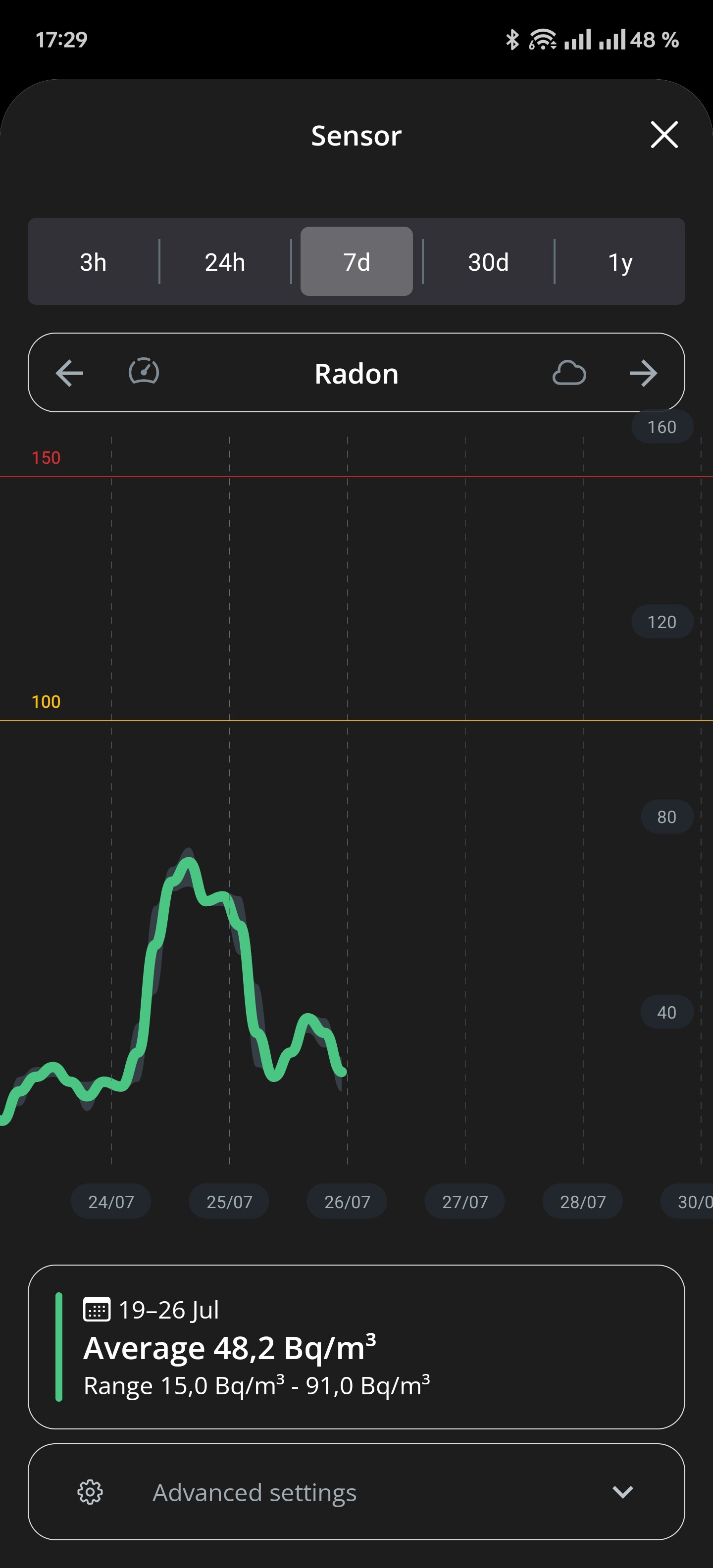 Jag har en digital radonmätare, Airthings View Plus, som jag vanligtvis har placerad i källaren. Just nu visar den 292 becquerel per kubikmeter. Under vinterhalvåret ligger den vanligtvis runt 130 becquerel per kubikmeter.