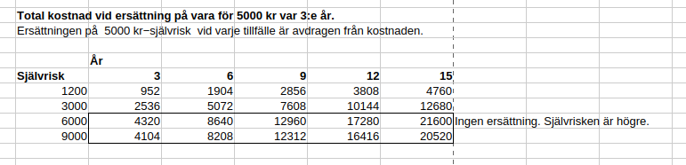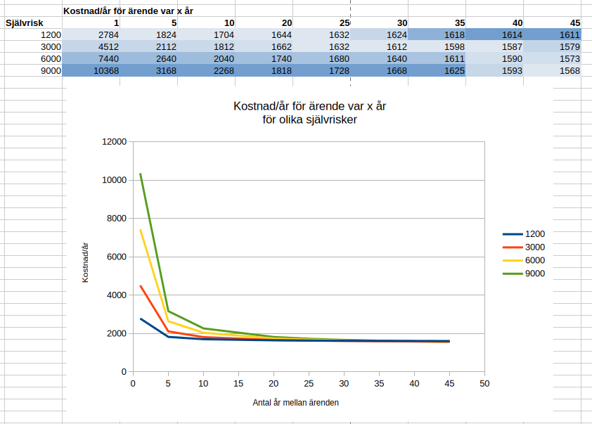 Har tyvärr inte koll på utility theory, men jag fick för mig att räkna lite på hemförsäkringen. Testade lite olika inställningar på hemförsäkringen när man söker ny försäkring hos försäkringsbolaget och kom fram till följande tabell. Sista kolumnen är gränsen för när månadskostnaden passerar kostnaden för självrisken (lite luddiga tankar just nu, så har svårt att formulera i text ).