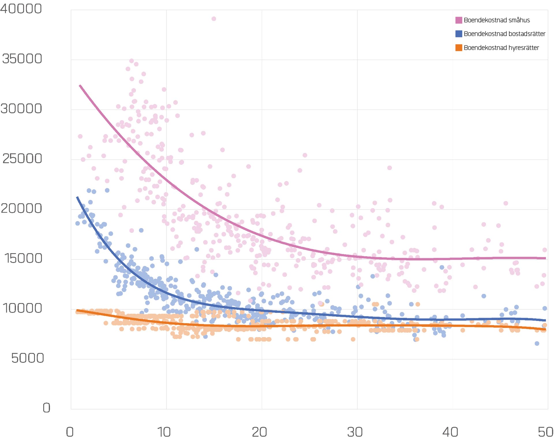 Man får då 4000 kr/månaden över att lägga på boendet. Med aktuell 3-årsränta samt alternativkostnad för ökad kontantinsats/pantbrev medräknad (börsen som alternativ investering) får jag det till att det motsvarar lånekostnader för ca 2 miljoner extra. I min stad kan man då välja att bo i en central villa med nära till allt för runt 6 miljoner eller en villa utanför stan för 4 miljoner där de flesta väljer att ha bil, månadskostnaden för båda blir snarlik.