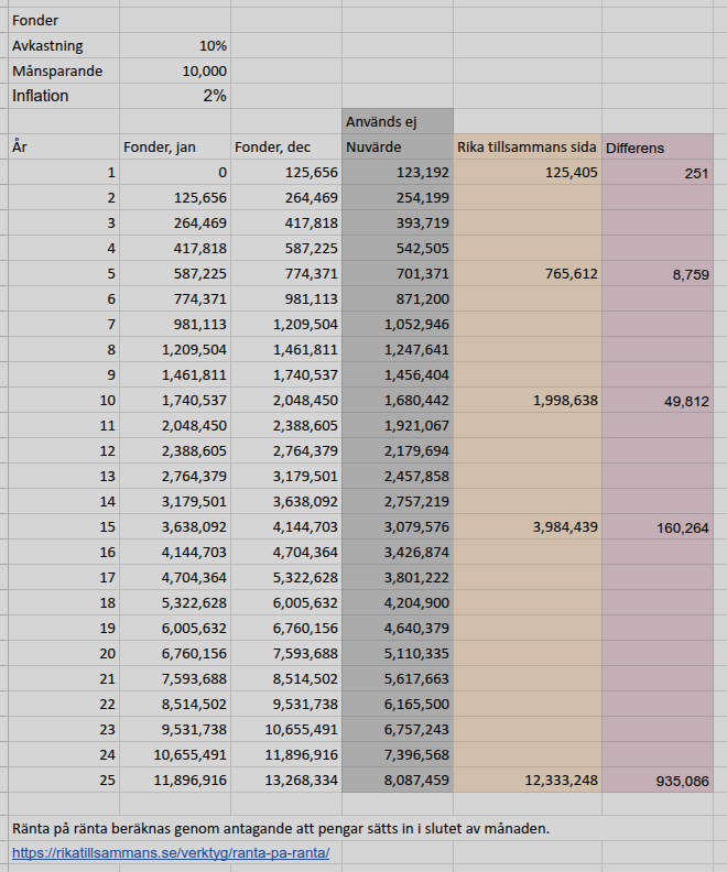Jag har en liten “snurra” i Google Sheets där jag gör beräkningar. Av någon anledning så jämförde jag mina egna formler för ränta på ränta med det som finns på Rika tillsammans hemsida. Döm om min förvåning då jag inte fick samma resultat som hemsidan. ![]()
