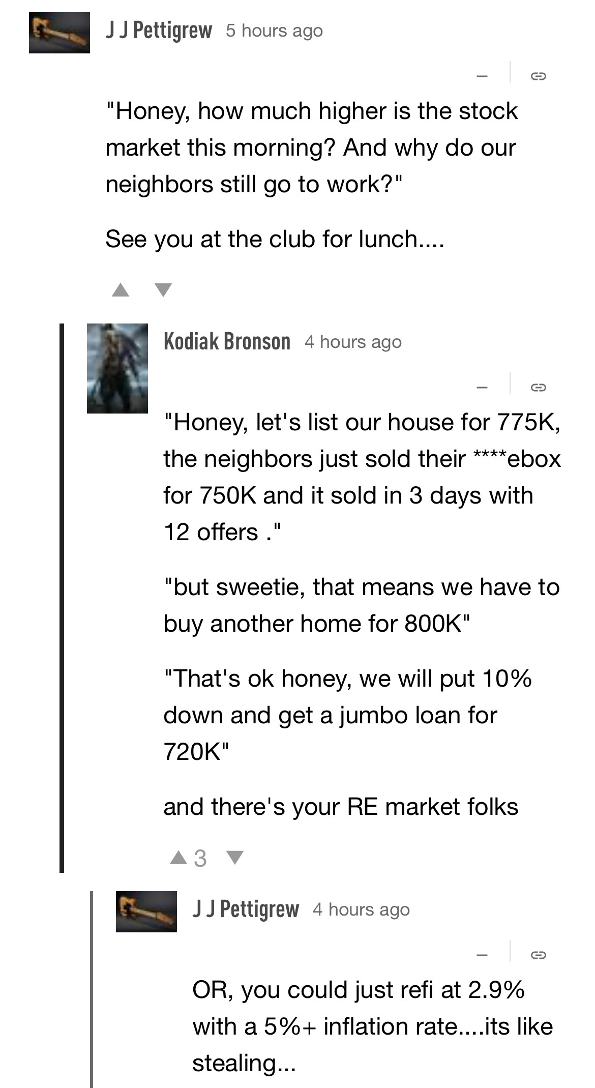Det högst troliga scenariot de närmsta åren är nog en stagflationsliknande miljö med minimala (försök till) räntehöjningar under en längre tidsperiod med hög inflation. Dvs inga större bekymmer om man har större lån, snarare bra då man betalar tillbaka med pengar som är värda mindre. Skulle Fed däremot göra det som krävs för att få ner inflationen och göra en tvåsiffrig räntehöjning à la Paul Volcker så skulle vi få en krasch som heter duga.