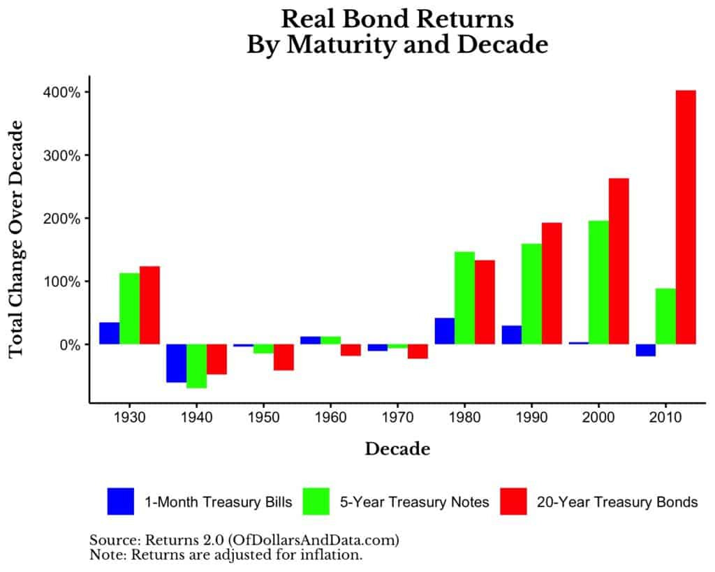 As predicted, as maturity increases so does risk and real return. However, these aggregate statistics hide a lot of what is happening with these bonds over time . If we were to look at the total real return by decade for these maturities, we would get a much better idea of their performance: