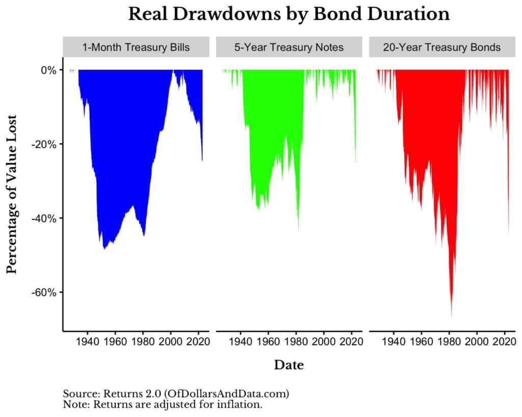 This is why maturity is the biggest determinant of a Treasury security’s risk and return. We can see this clearly in the data if we look at the average 1-year inflation-adjusted return and standard deviation of 1-month Treasury bills, 5-Year Treasury notes, and 20-Year Treasury bonds from 1926-2022: