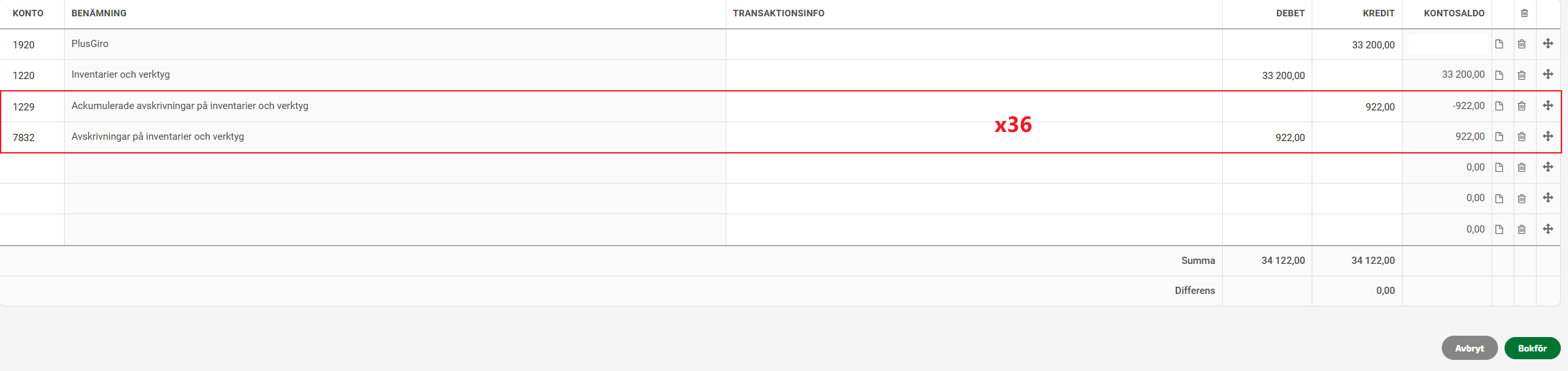Jag mistänker att eftersom kostnaden för datorn överstiger ett halvt prisbasbelopp behöver den tas upp i balansräkningen, och avskrivas över t.ex. 3 år. Jag funderar på hur detta redovisas med olika konton i Fortnox som jag använder. Företagets 1920 Plusgirokonto kommer väl belastas med den fulla kostnaden i samband med att köpet görs och datorn betalas? Eller är det där jag går fel? Bör detta redovisas som en “leverantörsskuld” enligt räkneexemplet som finns här? Men då med kontot 1250 Datorer istället för kontot 1220 Inventarier och verktyg? Och sedan en kostnad på 922,22 kronor per månad (33200/36) som bokförs på 7832 Avskrivningar på inventarier.