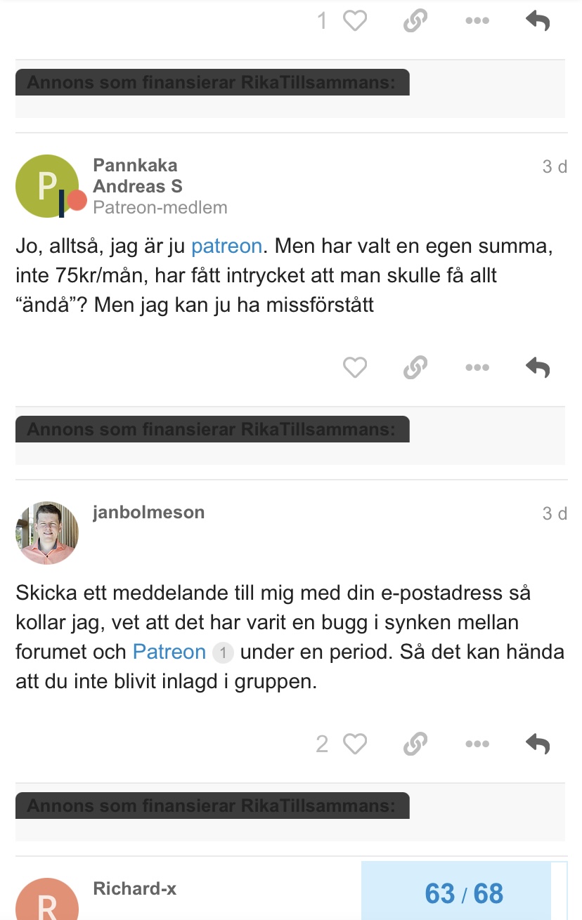 Jo, alltså, jag är ju patreon. Men har valt en egen summa, inte 75kr/mån, har fått intrycket att man skulle få allt “ändå”? Men jag kan ju ha missförstått