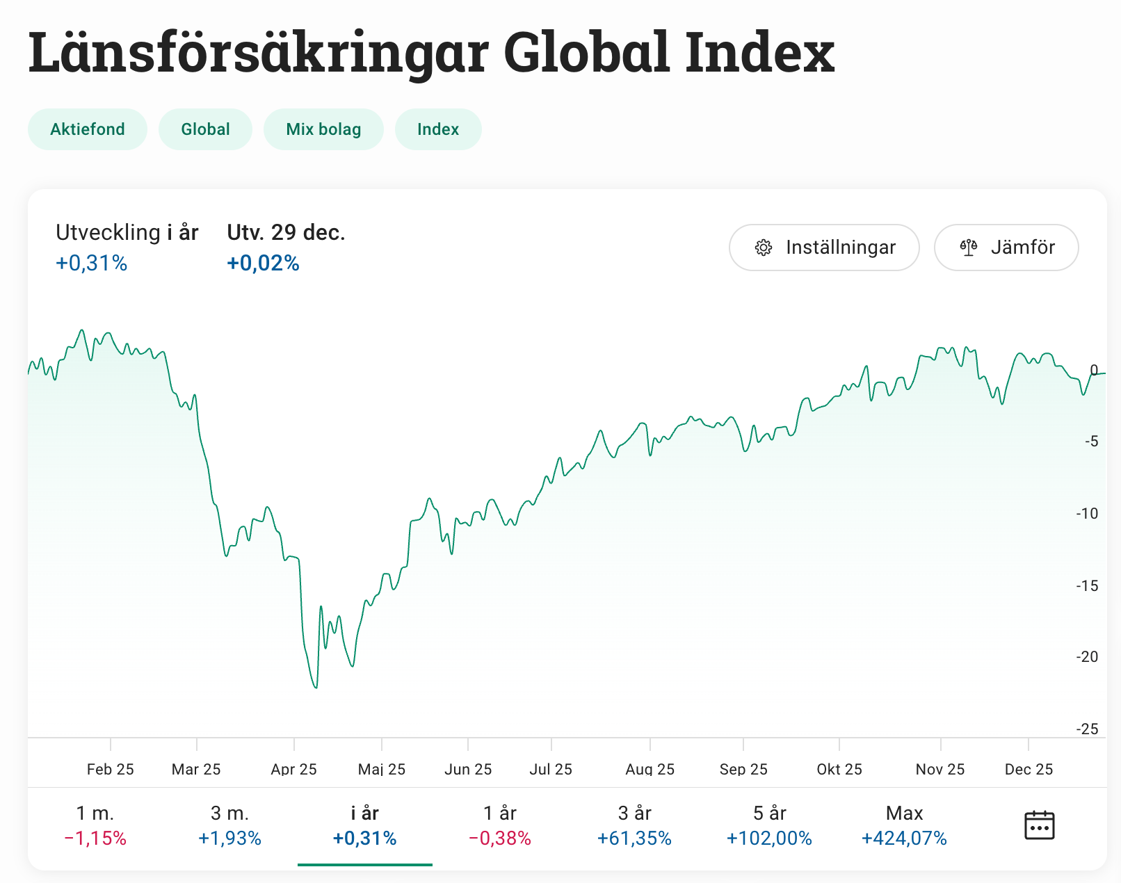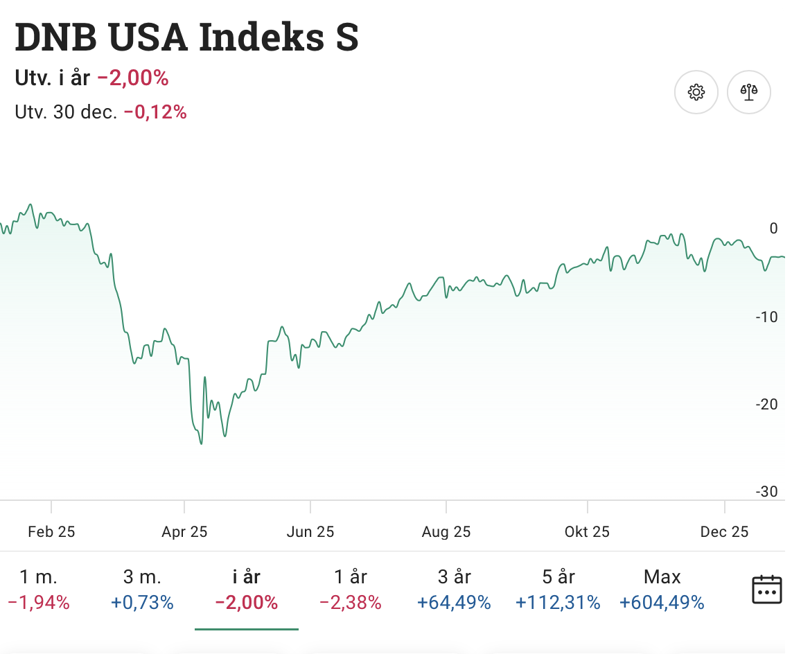 Jag har delat upp min portfölj i ett par delar. En del med globalfonder, en del med svenska investmentbolag och en allvädersdel. Jag bedömer att det sprider riskerna en del gällande blanda annat valutaeffekten. Men håller med om att man ska utvärdera på minst 5 års sikt så jag fortsätter fylla på i globalfonderna trots tråkig utveckling just 2025 men det kommer andra år framåt där utvecklingen är bättre.