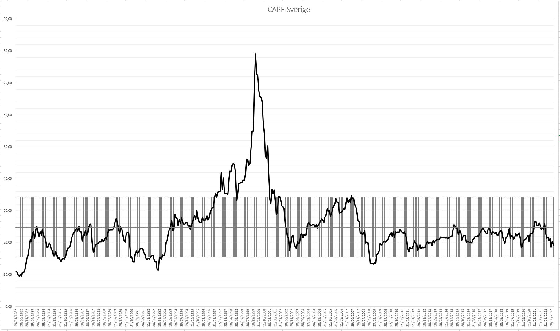 Indikerar bandet en standardavvikelse upp respektive ned? På CAPE måttet så är ju OMXS inte överdrivet högt värderat. Samtidigt vet man ju att vinster är betydligt mer volatila än mer andra värderingsmått som P/S pch P/B. Jag har letat utan framgång efter P/S och P/B för hela börsen men inte hittat något. Har du några källor på dessa nyckeltal?