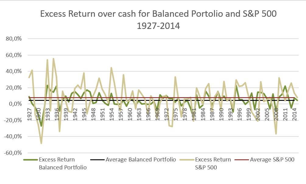 Nedan som ett exempel på volatilitet och genomsnittlig avkastning över riskfria räntan från 1927 till 2014 för S&P 500 och en balanserad portfölj bestående av 20% aktier, 20% råvaror, 30% statsobligationer och 30% realränteobligationer. Avkastningen är liknande, men volatiliteten är betydligt lägre för den balanserade portföljen.