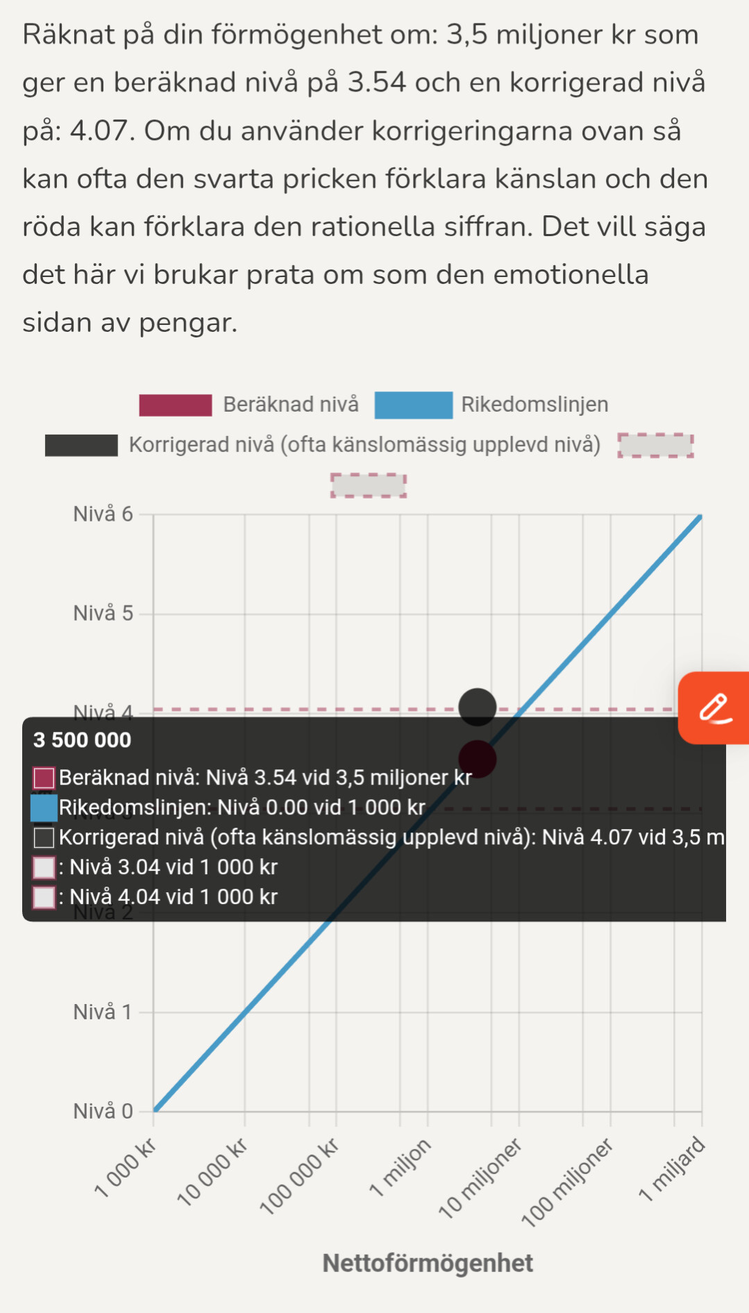 Tycker också som @TroubleOnNeptune nämnde att korrigeringen för åldern är lite klurig. Jag som relativt ung (33) känner mig rik för att jag “redan” har relativt stor nettoförmögenhet (nivå 3) medan korrigeringen är negativ. Personligen tänker att jag skulle känna mig mindre rik om det hade tagit mig 10 år till att komma upp till samma summa? Förstår dock såklart resonemanget att det inte blir så mycket att leva på per månad om det skulle räcka resten av livet och förmögenheten inte fortsatta öka.