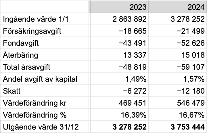 Hej Sture, tack för svar. Den totala årsavgiften försäkringsavgift+fondavgift-återbäring var 59 107 kr för 2024 så ganska mkt ändå. Jag har dragit igång en flytt till avanza där jag lägger allt i en global indexfond med låg avgift istället.