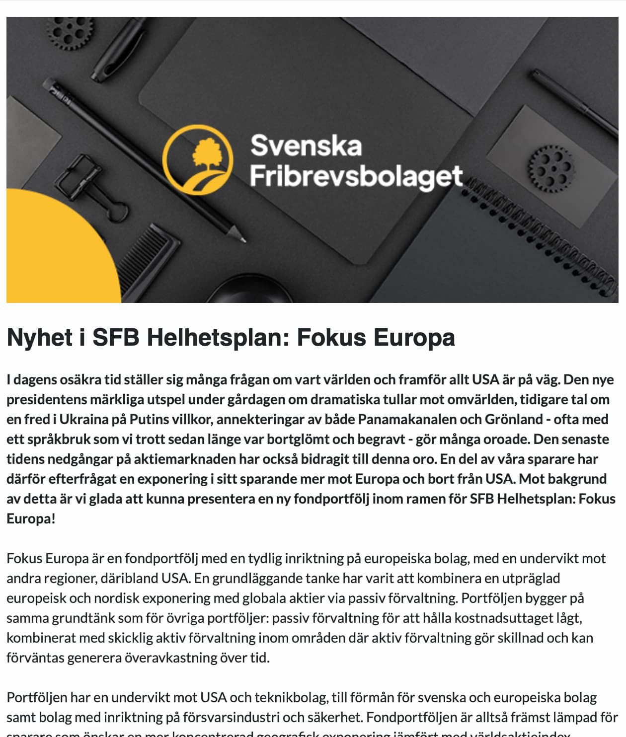 Cool, ja med en global indexfond får du ju ner priset. Kanske fult men en av anledningarna till att jag har både Avanza och Fribrevsbolaget är att då kan jag följa Fribrevsbolagets förvaltning och hämta inspiration från, fick precis detta på mail, se bild…