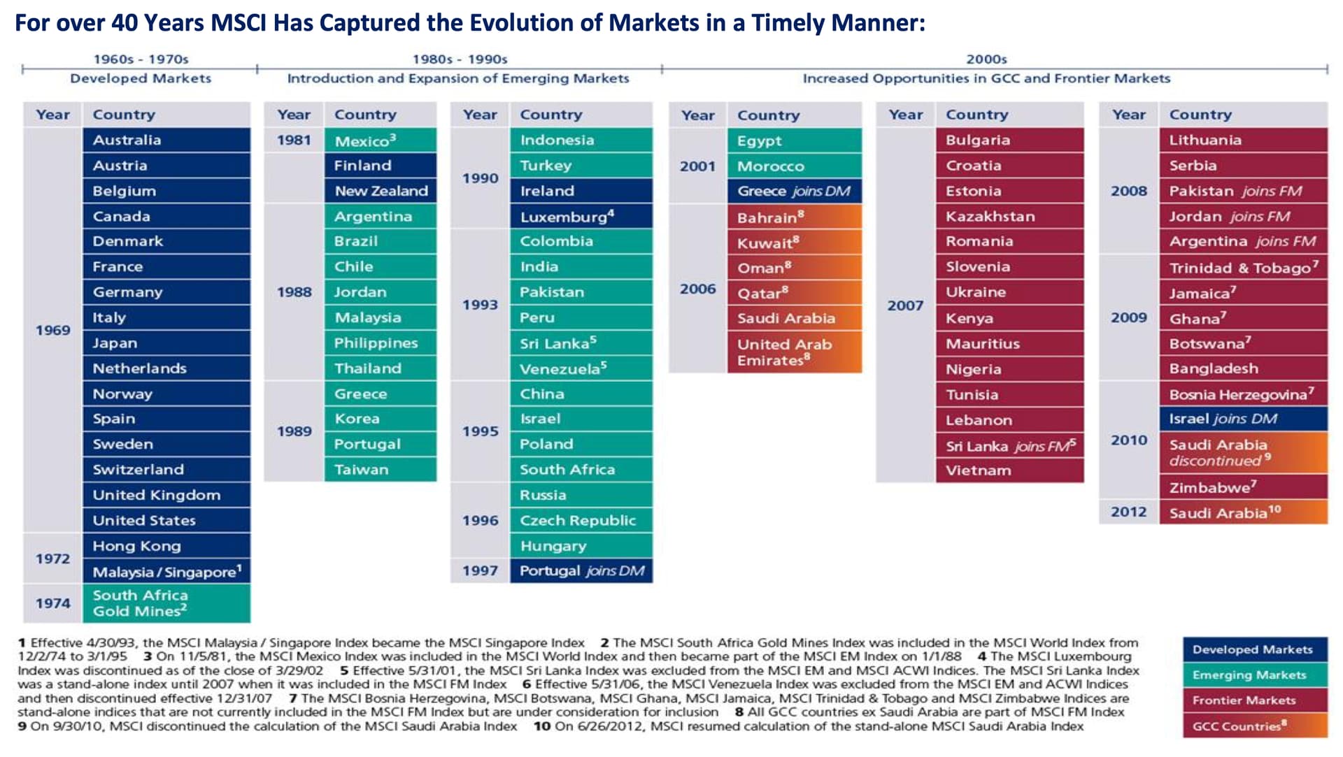 Korea, for example, is a fairly developed economy with several world class companies. However, Korea’s equity market is not yet at the developed level when objectively compared to the 24 markets that MSCI classifies as developed. Korea, which has been under review by MSCI for developed status for the last 5 years, will only be reclassified when accessibility issues are resolved and following a consultation with investors.