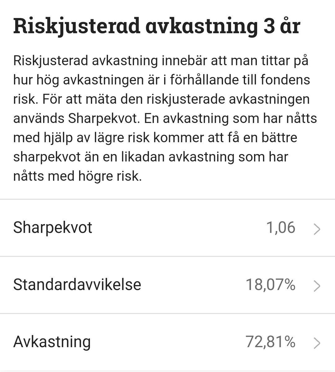Har läst förklaringarna som ges på Avanzas. Men hur ska jag värdera alla tre parametrar tillsammans? Är tex en avkastning på 72 % bra eller dåligt i förhållande till sharpekvot på 1,06 och/eller standardavvikelse på 28 %? Och/eller jämförelse tvärtom.