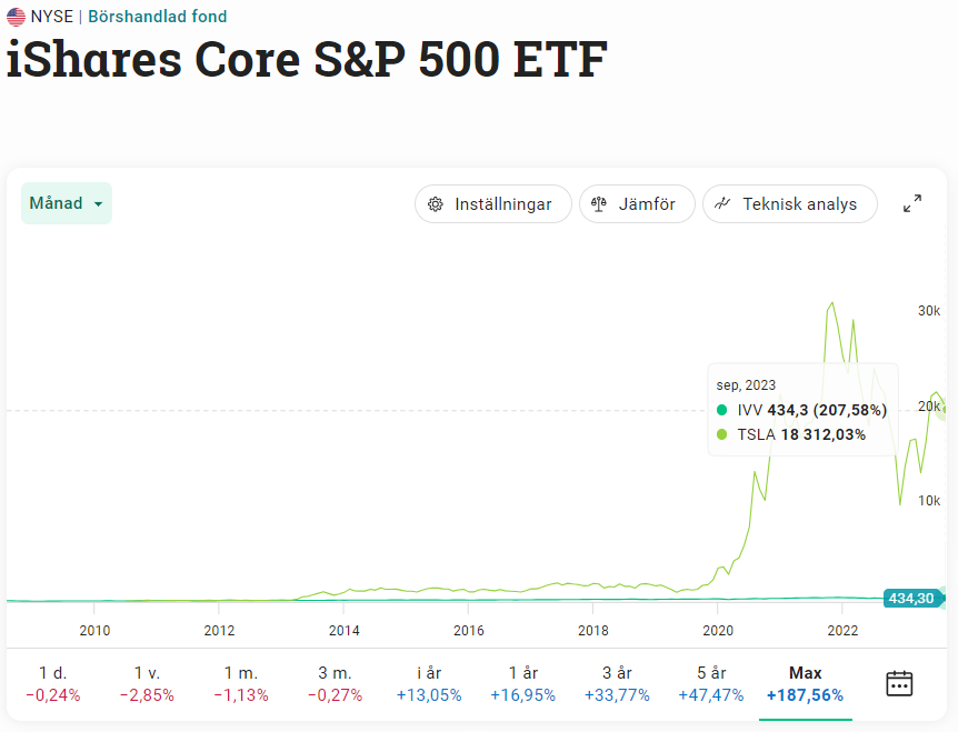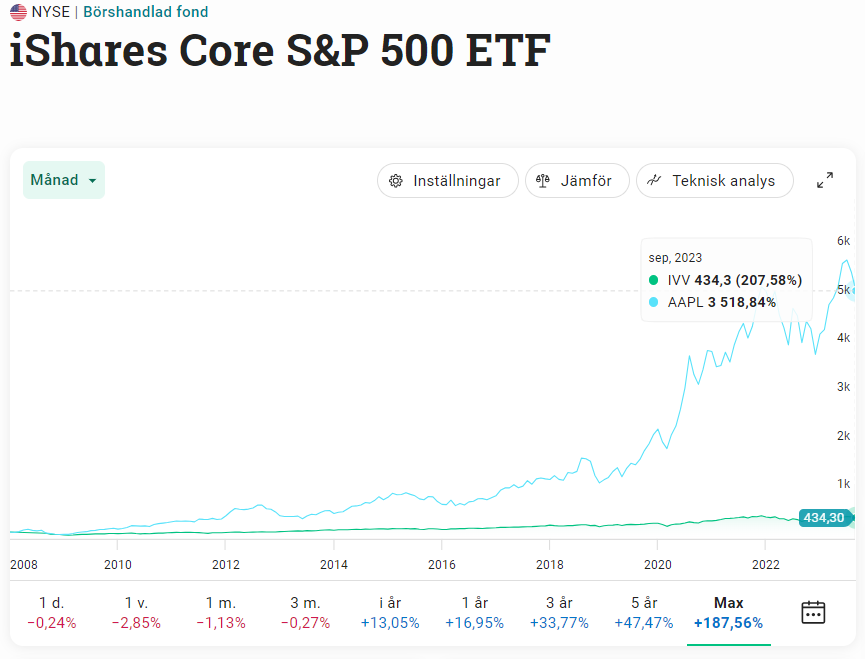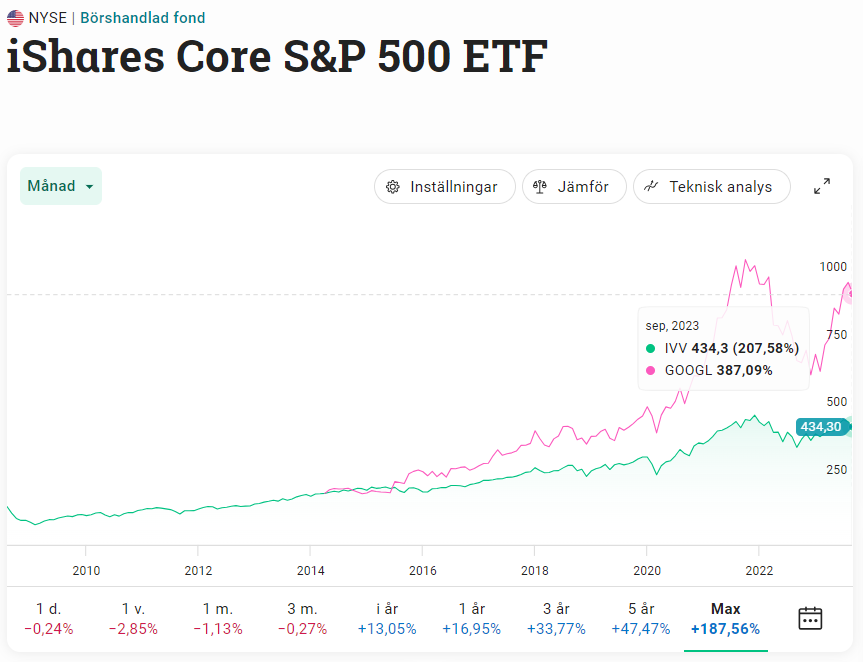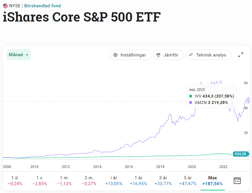 Jämförelse enskilda stocks VS. en S&P 500 ETF, via iShares.