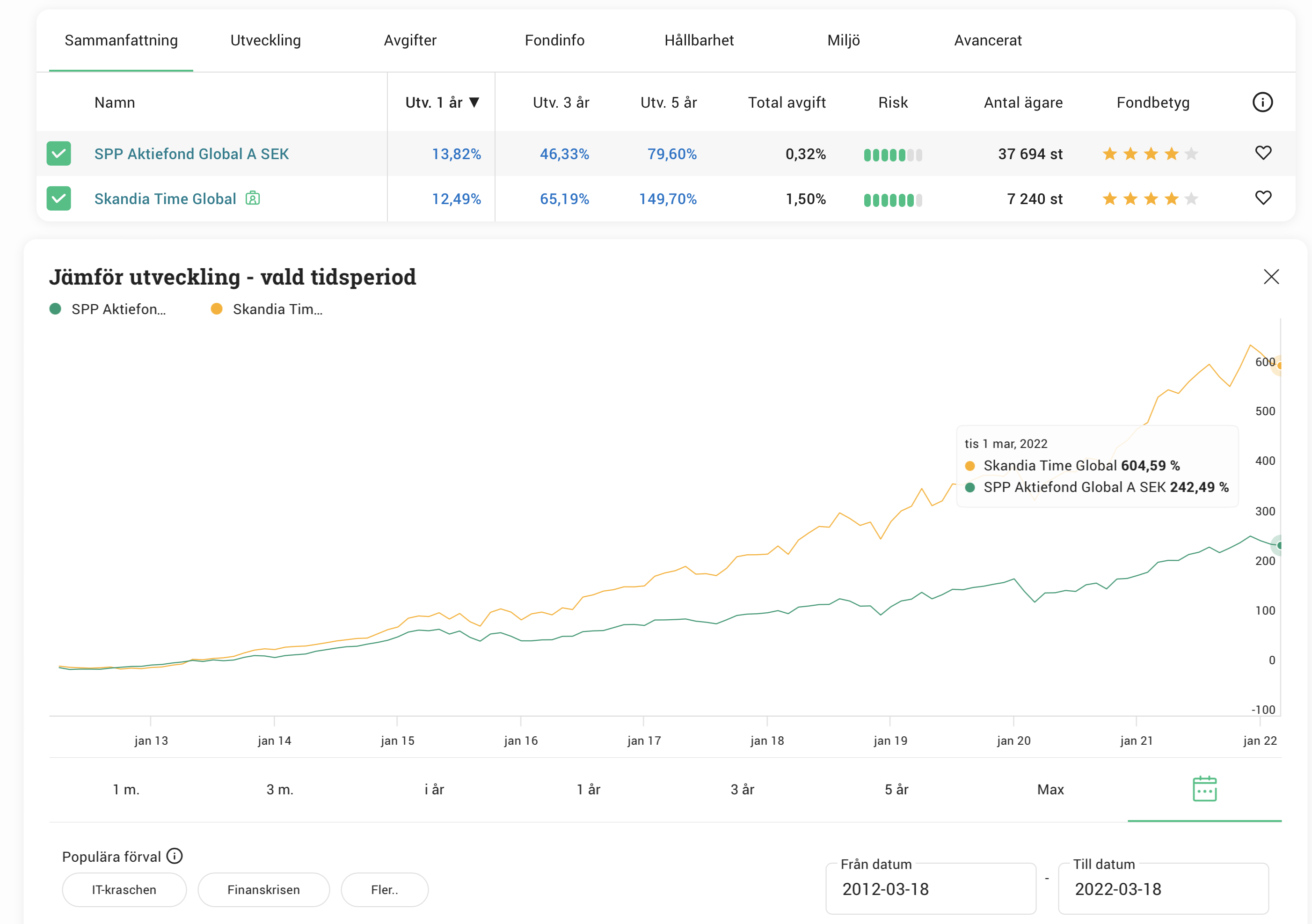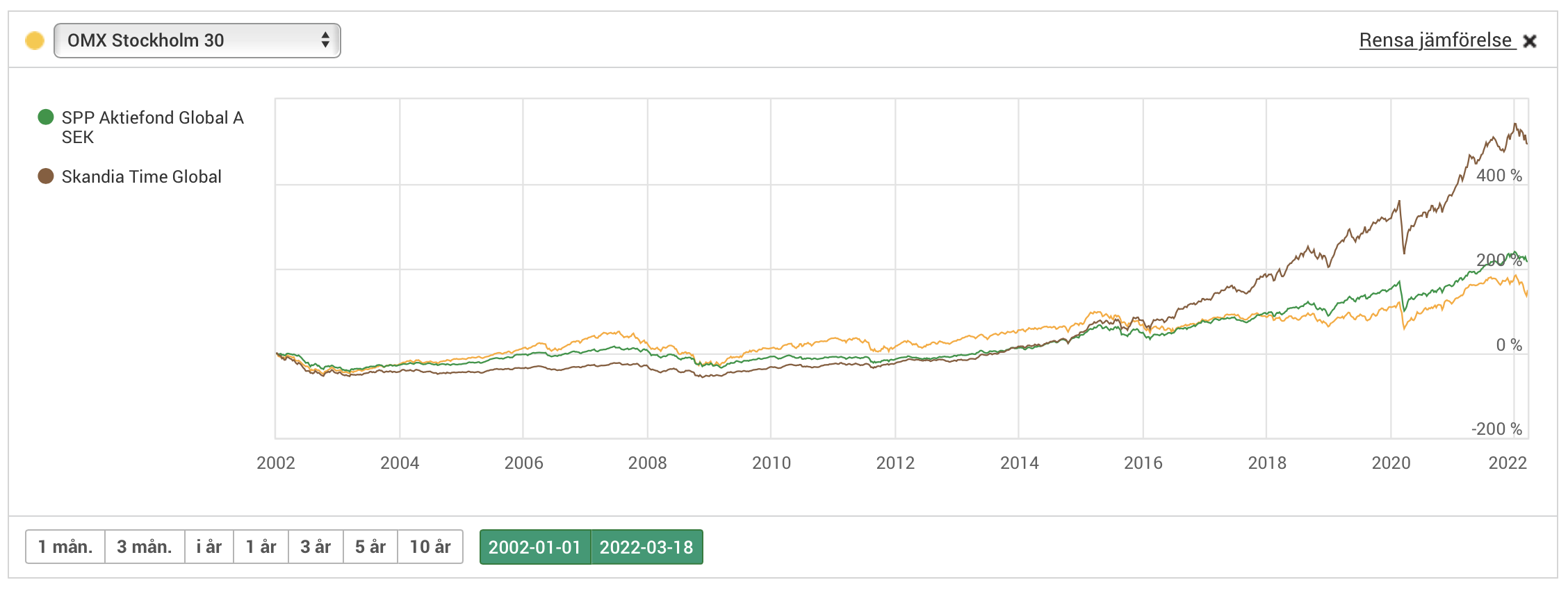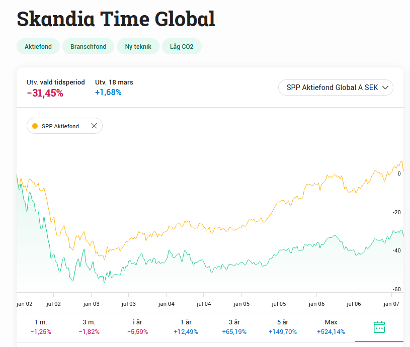 Jag tänker att hur den gick 2002-2007 har mindre bäring på framtiden än hur den gått de senaste åren. Just i år går fonden ungefär som SPP Aktiefond Global.