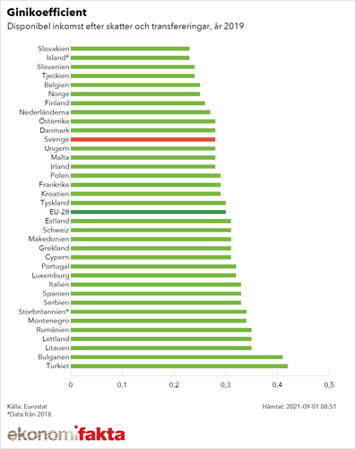 Jag har suttit en liten stund och googlat kring gini-koefficienten och enligt siffrorna jag hittar har Sverige en låg, bland de lägre i EU?