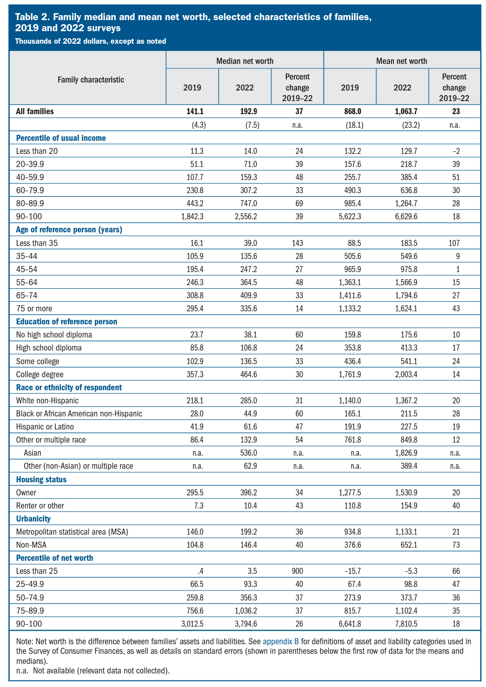 The net improvements in economic performance, including rising house and corporate equity prices that well exceeded consumer price inflation, supported substantial increases in median and mean inflationadjusted net worth—the difference between families’ assets and liabilities—between 2019 and 2022 (figure 2).18Specifically, real median net worth surged 37 percent to $192,900, and real mean net worth increased 23 percent to $1,063,700 (table 2), accelerating the steady growth experienced over the 2013–19 period.19The 2019–22 changes imply some narrowing of the wealth distribution between surveys. Indeed, growth in median net worth was the largest increase over the history of the modern SCF, more than double the next-largest one on record.20