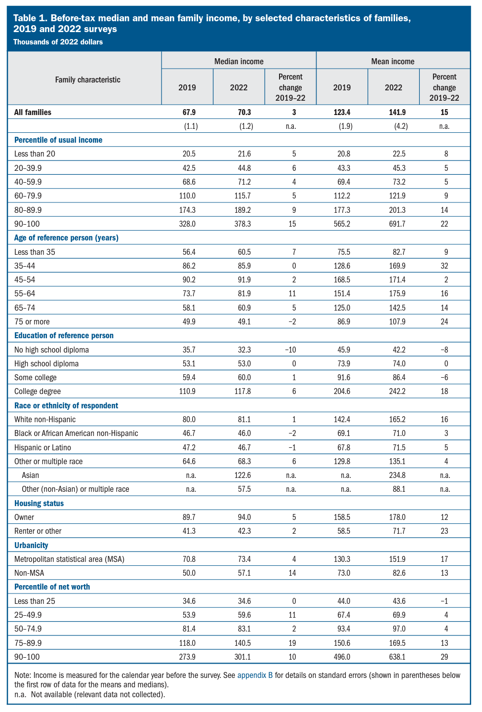 During the three years between the 2019 and 2022 surveys, the COVID-19 pandemic caused severe disruptions to the U.S. labor market and broader economic activity, leading to unprecedented levels of fiscal support.5 Against this backdrop, U.S. families experienced increases in median and mean inflation-adjusted income, measured for the year before the survey (figure 1). Median income rose a relatively modest 3 percent, from $67,900 in 2018 to $70,300 in 2021. Mean income increased 15 percent—one of the largest three-year changes in mean income over the history of the modern SCF— from $123,400 in 2018 to $141,900 in 2021 (table 1). Gains in income were experienced across the income distribution but were largest toward the top, consistent with some increase in income inequality over this period.