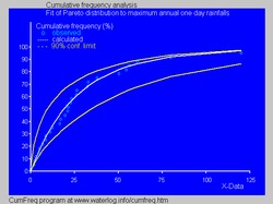 In hydrology the Pareto distribution is applied to extreme events such as annually maximum one-day rainfalls and river discharges.[30] The blue picture illustrates an example of fitting the Pareto distribution to ranked annually maximum one-day rainfalls showing also the 90% confidence belt based on the binomial distribution. The rainfall data are represented by plotting positions as part of the cumulative frequency analysis.