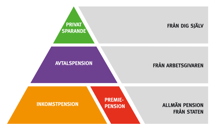 Tjänstepension (lila) brukar inte sättas av innan man är 25 om har en vanlig anställning, men de avsättningar man fått investerar man vanligtvis i aktiefonder som ger ränta på ränta.