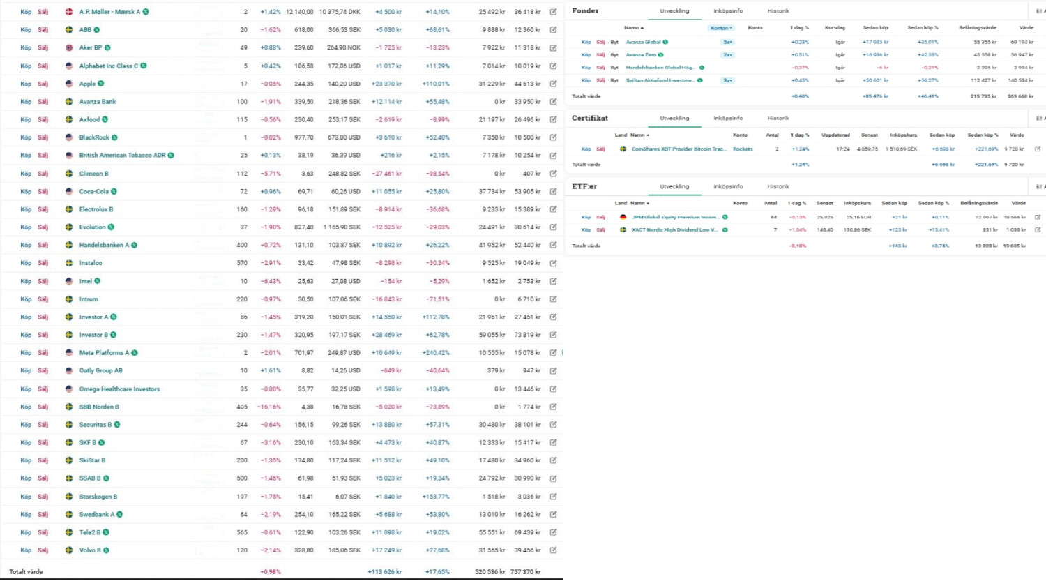 Jag bifogar min portfölj här i bild för att ni ska få en bättre blick i mina innehav. Min fundering är vad ni tycker jag ska göra? Sälja allt och omfördela i 4-5 fonder bara istället för att minimera riskerna att förlora en stor del och vara nöjd?