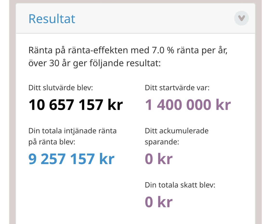 Tack för info, om jag ej är intresserad av att belåna bostaden, skulle du då luta pt att det kan vara bättra att sälja och placera på tex ISK. Det finns ju ingen garanti för hur börsen kommer utvecklas men på lång sikt och men den beräkningen du visade känns ju en placering på 1,4 mille inte helt fel…?