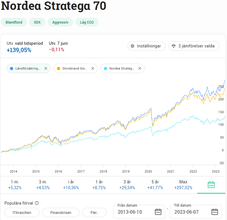 Håller med @Robinjoh om att byta och om förslagen billiga globalfonder. Att jämföra Nordea Stratega 70s utveckling med dessa fonder är dock inte rättvisande. Länsförsäkringar och Storebrands globalfonder i grafen innehåller 100% aktier. Nordea Stratega 70 innehåller endast 70% aktier och resten räntor. En bra jämförelse skulle kunna vara mot Lysa i fördelningen 70/30.