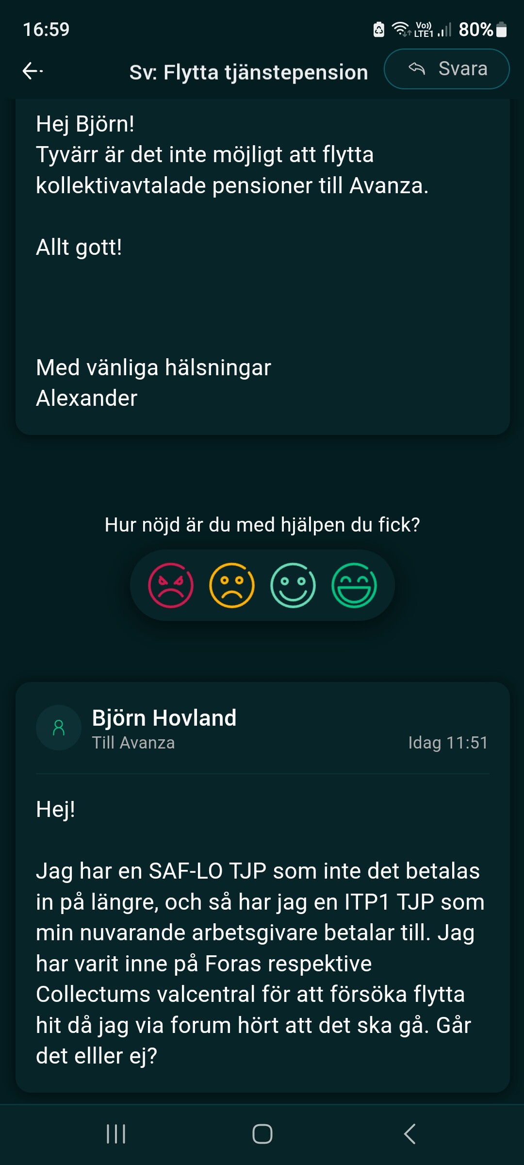 Jag vet inte riktigt vad de skulle tjäna på det. Återigen, du kan inte flytta en kollektivavtalad tjänstepension till Avanza, varken via Avanza eller via en valcentral. Det är helt enkelt inte ett valbart alternativ. Så de har ju rätt i sak i sitt svar till dig.