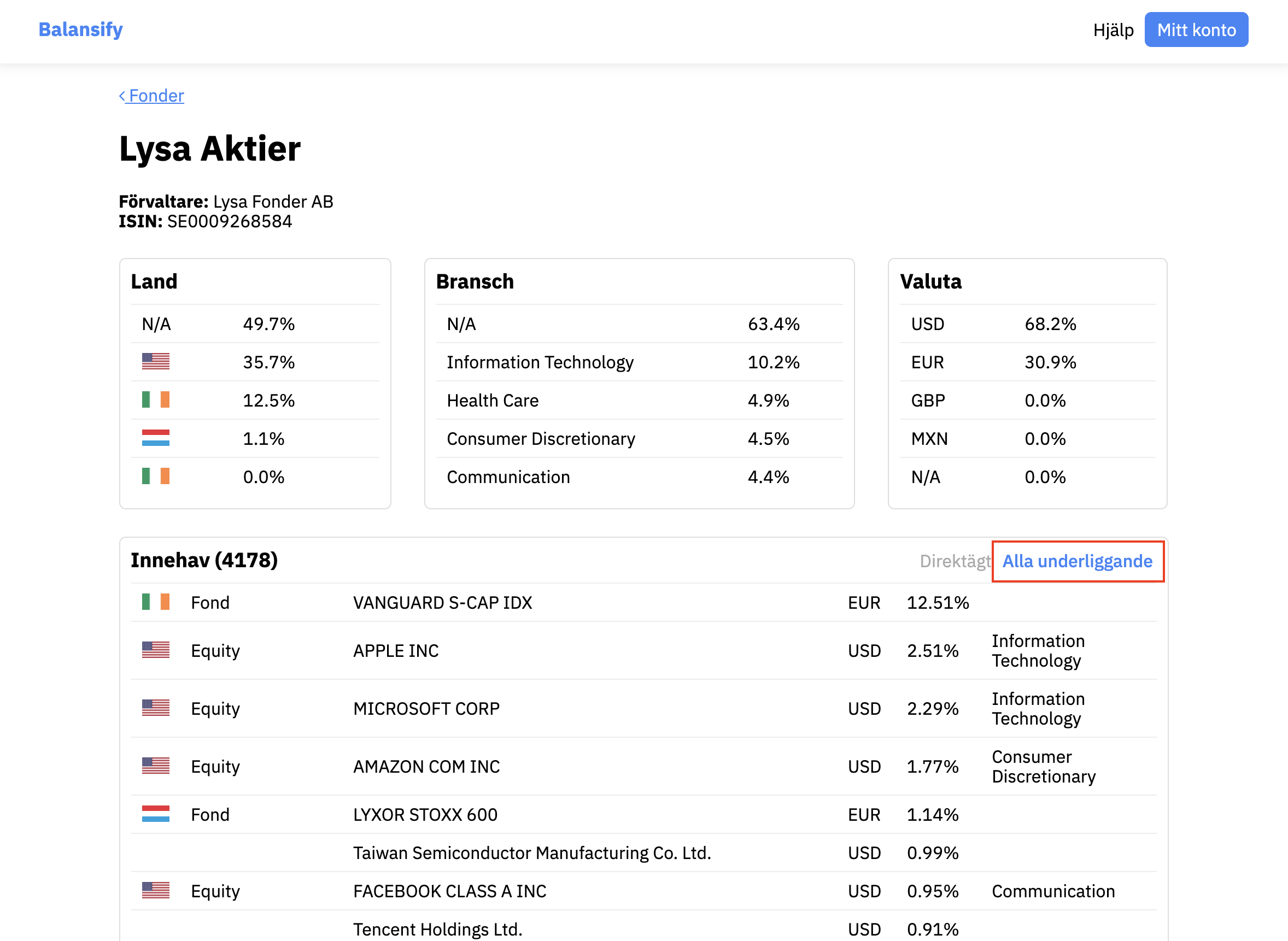 För varje fond går det att få fram en enkel sammanställning av allt innehav, sorterat på storlek. En sammanställning av länder, branscher och valuta visas också.