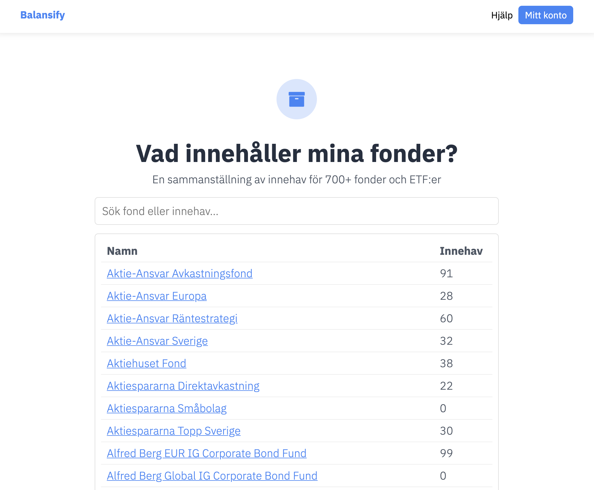 För att lösa detta är jag byggt ett verktyg (som en del av Balansify) som listar (vad jag tror är) alla Svenska fonder.