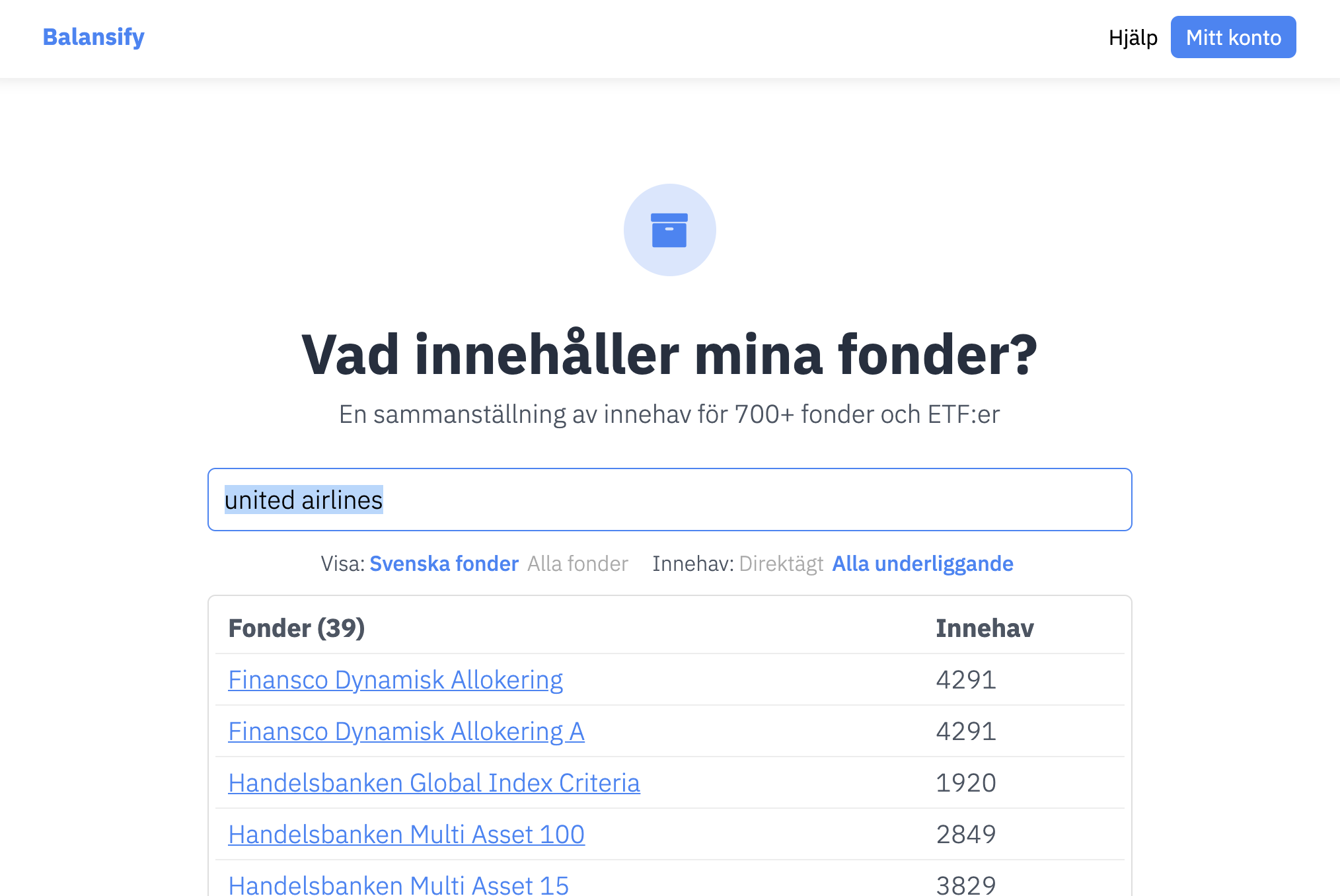 Sök fonder och innehav (innehav söker endast direkt-ägt innehav i dags läget). T.ex. att söka “Tesla” kommer inte visa “Lysa” eftersom Lysa inte äger Tesla direkt, de äger Tesla genom bl.a Vanguard S&P500. Jag ska försöka förbättra det senare.