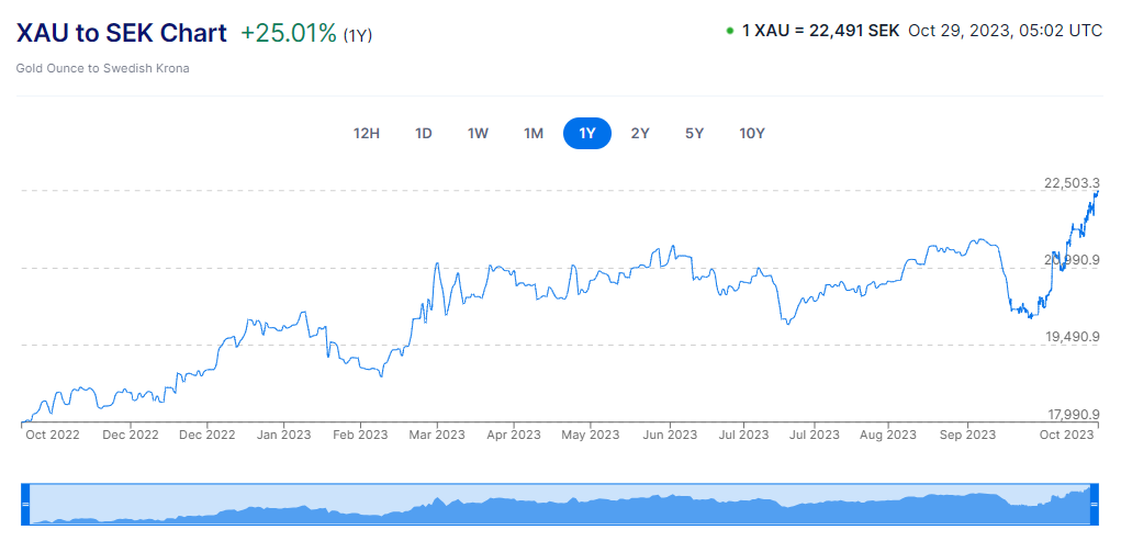 Guldet fortsätter sin resa uppåt. Nu upp 25% på ett år mot kronan.