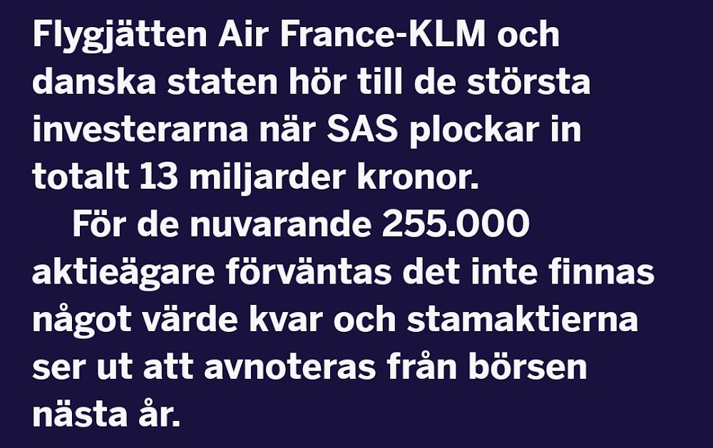 SAS är nu värt 2 miljarder och de får in kapital värt 13 miljarder och då till en kurs som säkert ligger en bra bit under vad den nu står på så små spararna har kvar sina aktier men nu kanske det finns 100x mer aktier än tidigare så priset per aktier blir därefter.