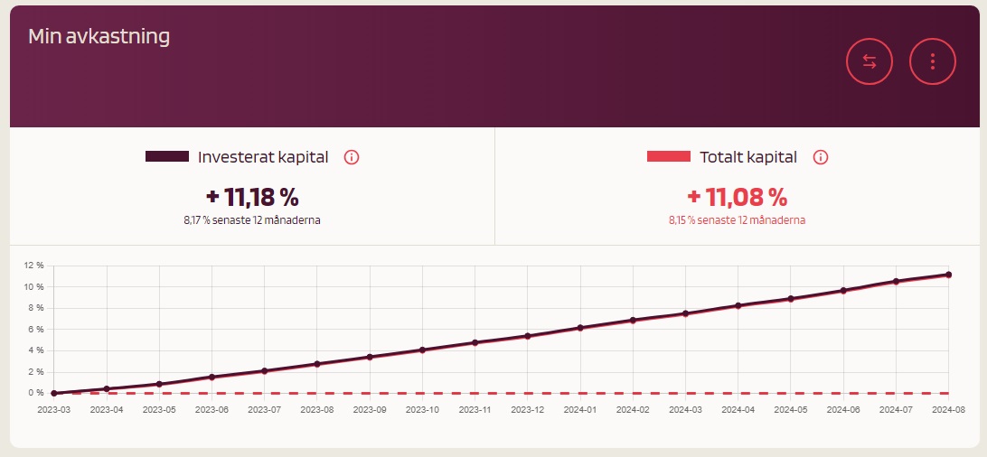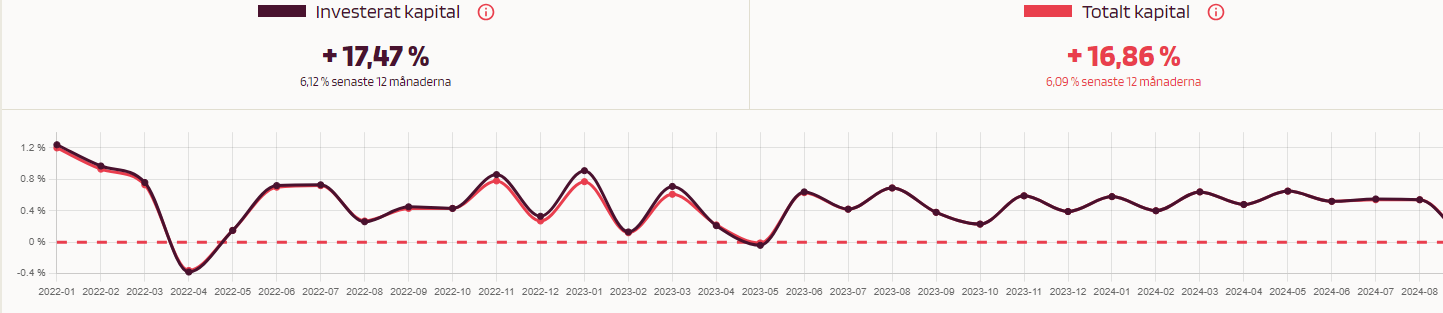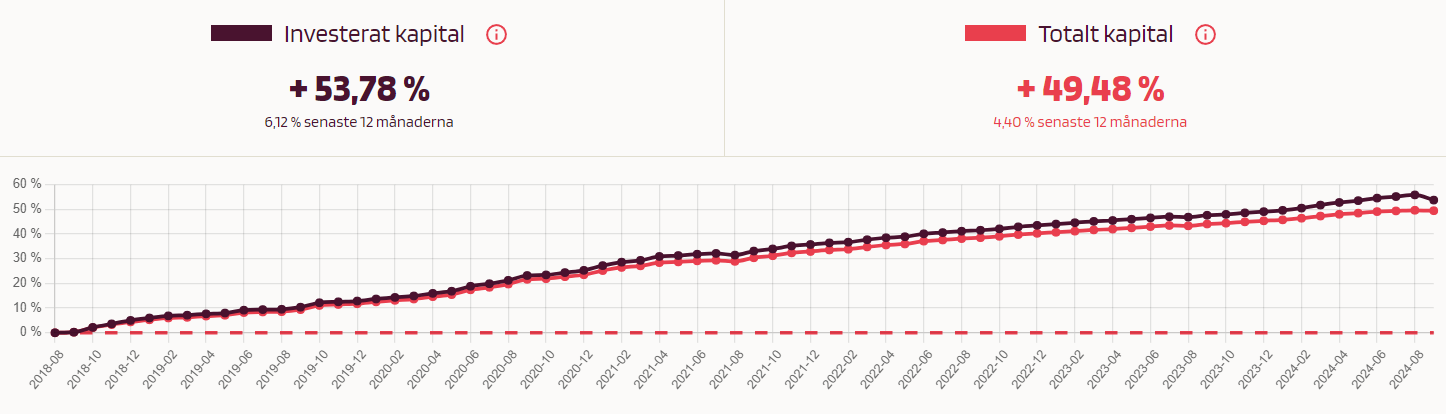 Tack! Min depå har avkastat med en halv procent per månad, vilket borde bli 6% på ett år. Jag har bara några tusen kr där, men nu börjar det kännas ok att skjuta till mer.