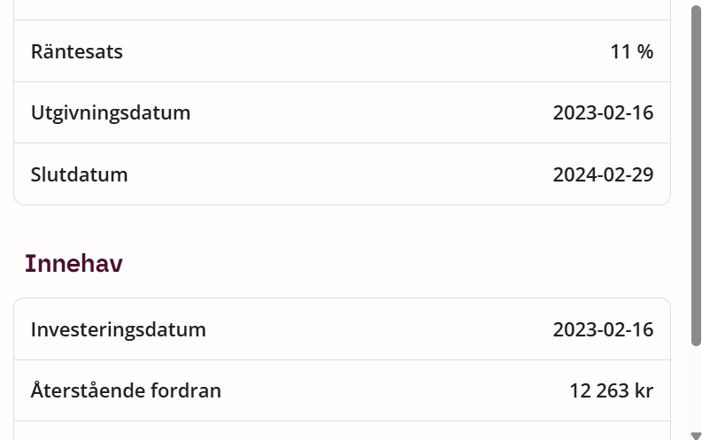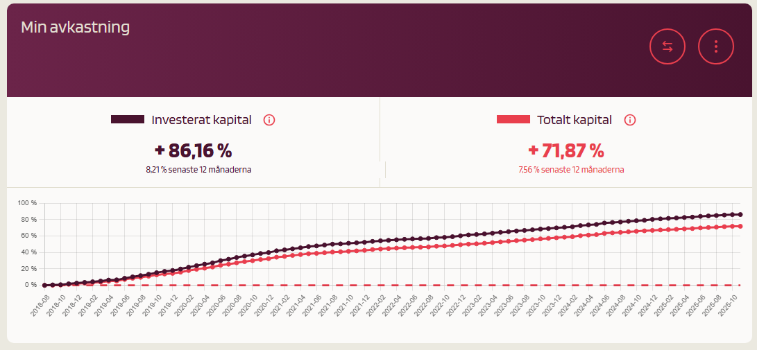 Oj det var riktigt illa. Jag var som mest inne med över 80k. Än så länge 5k kreditförluster och drygt 4k i försenade krediter. Avkastningen inklusive kreditförluster är betydligt bättre än sparkonto men jag har sedan två år pausat alla investeringar för att ta ut allt.