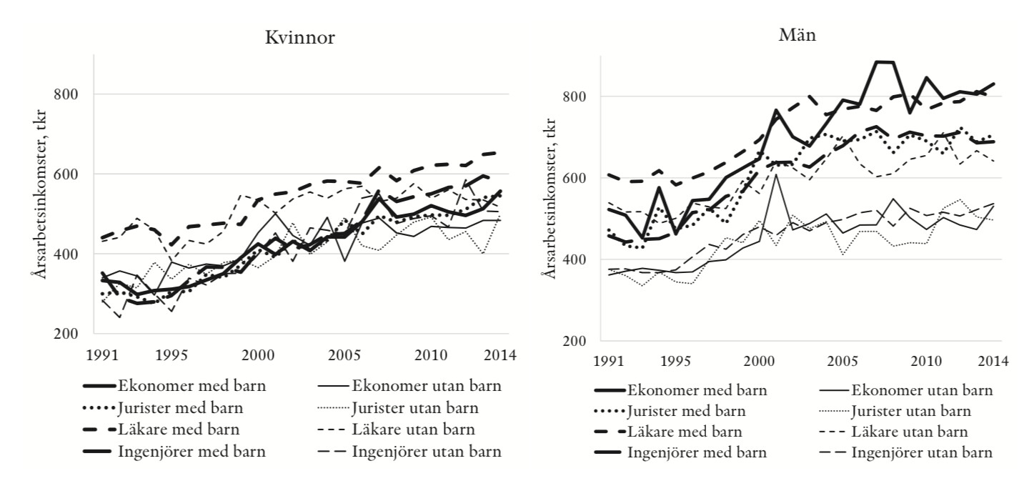 Det går också att se att det finns skillnader i livsinkomst mellan de som har barn och de som inte har barn, och att mönstret ser olika ut för kvinnor och män. Kvinnor med barn har lägre livsinkomst än kvinnor utan barn. För män är det tvärtom, män som har barn har en högre livsinkomst än de utan barn.