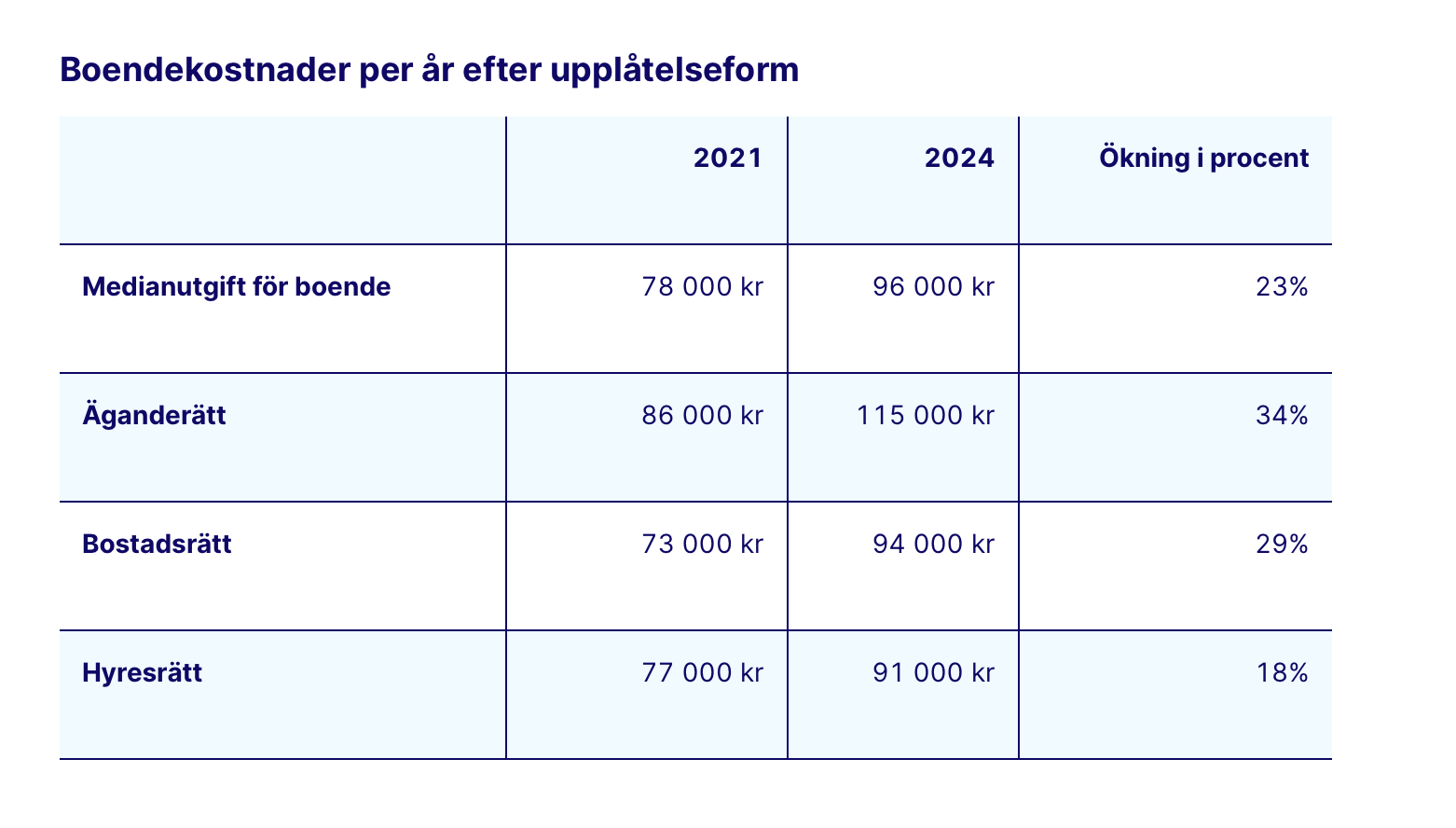 Boendeutgift äganderätt: Boendeutgift avser summan av ränteutgift, tomträttsavgäld, amortering, driftsutgift (tex. uppvärmning, vatten, avlopp och sophämtning) samt utgift för underhåll och reparation av bostaden, och är korrigerad med hänsyn till skatteeffekt.