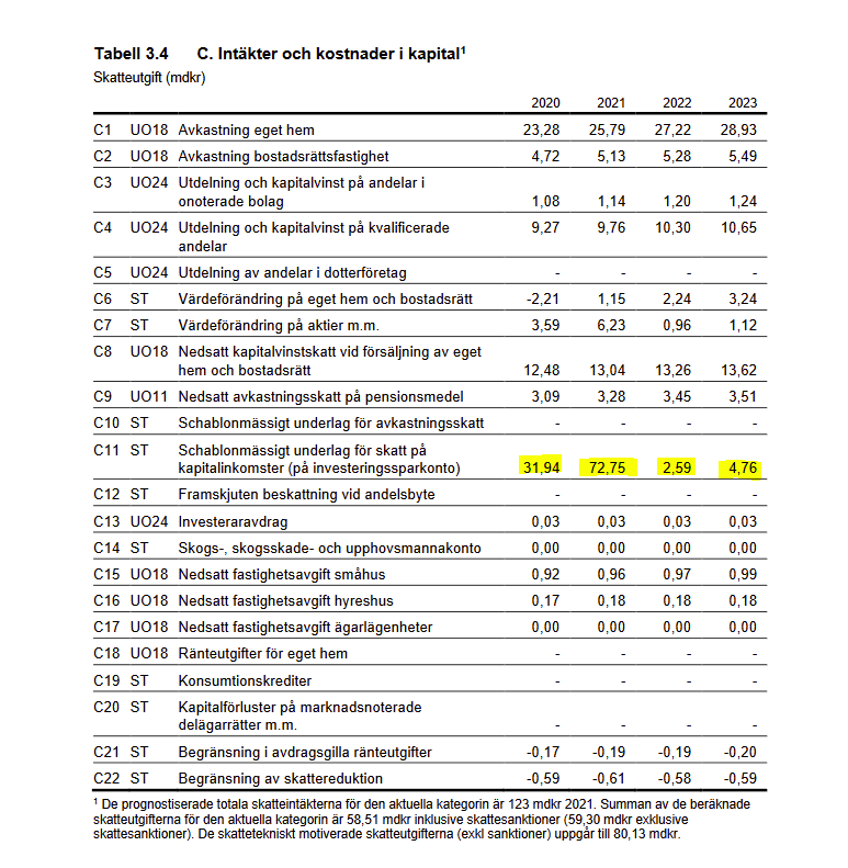 Skatteutgiften C11 Schablonmässigt underlag för skatt på kapitalinkomster (på investerings- sparkonto) har reviderats för samtliga år. Skatteutgiften korrelerar i hög grad med den förväntade utvecklingen på aktiemarknaden. Eftersom skattebasen är stor kan även förhållandevis små förändrade förväntningar på utvecklingen på aktiemarknaden innebära stora beloppsmässiga skillnader i storleken på skatteutgiften.